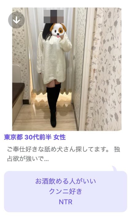 プロフィールに「舐め犬」と書いている女性を表示できます。
