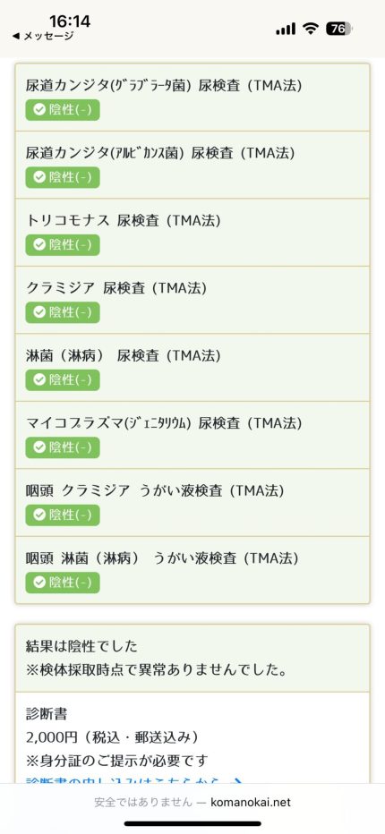 ホーム > 性病検査の結果の一覧 性病検査の結果をこのページにまとめます。 性病検査を受けるたびに追記していきます。 使用している性病検査キットは性病検査キット 男性:8項目(Amazon)。 2024年6月1日 すべて陰性でした。 2025年1月19日 author