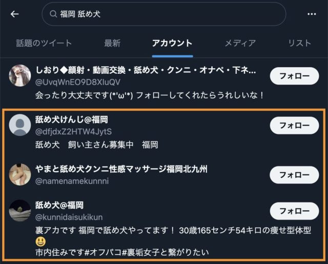 - 舐め犬のアカウントのフォロー欄を見る。裏垢女子をフォローしていることが多い。