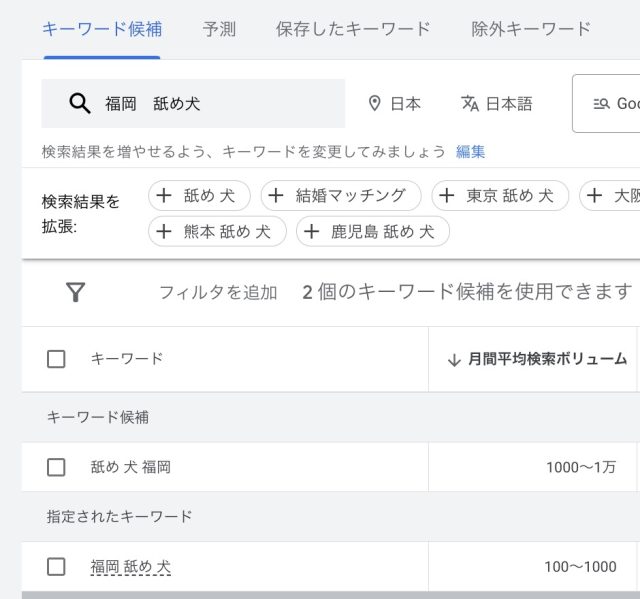ちなみに「舐め犬 福岡」の月間検索ボリュームは1,000〜1万。「舐め犬 福岡」で検索上位に表示されると申し込みがかなり来るはず。